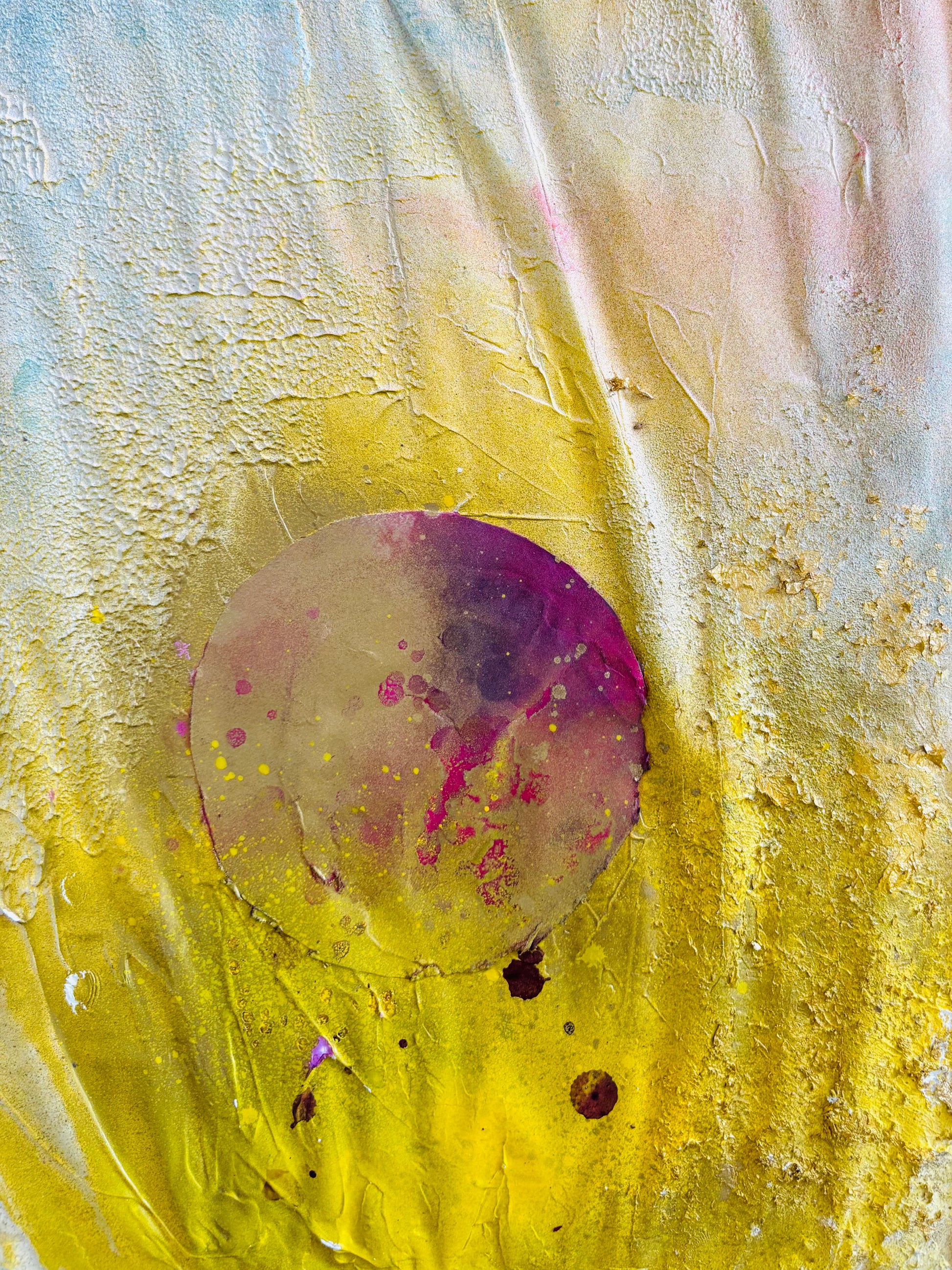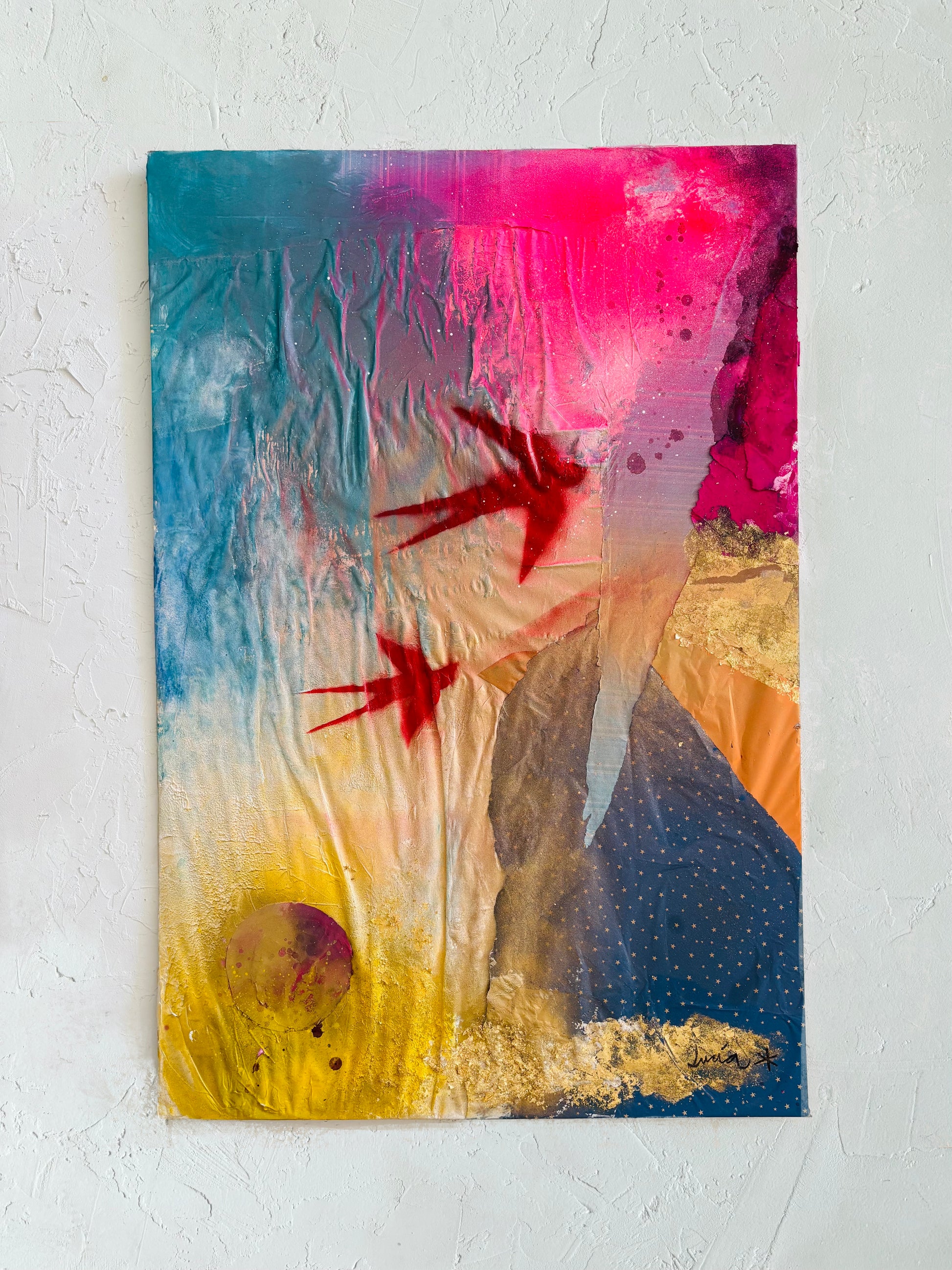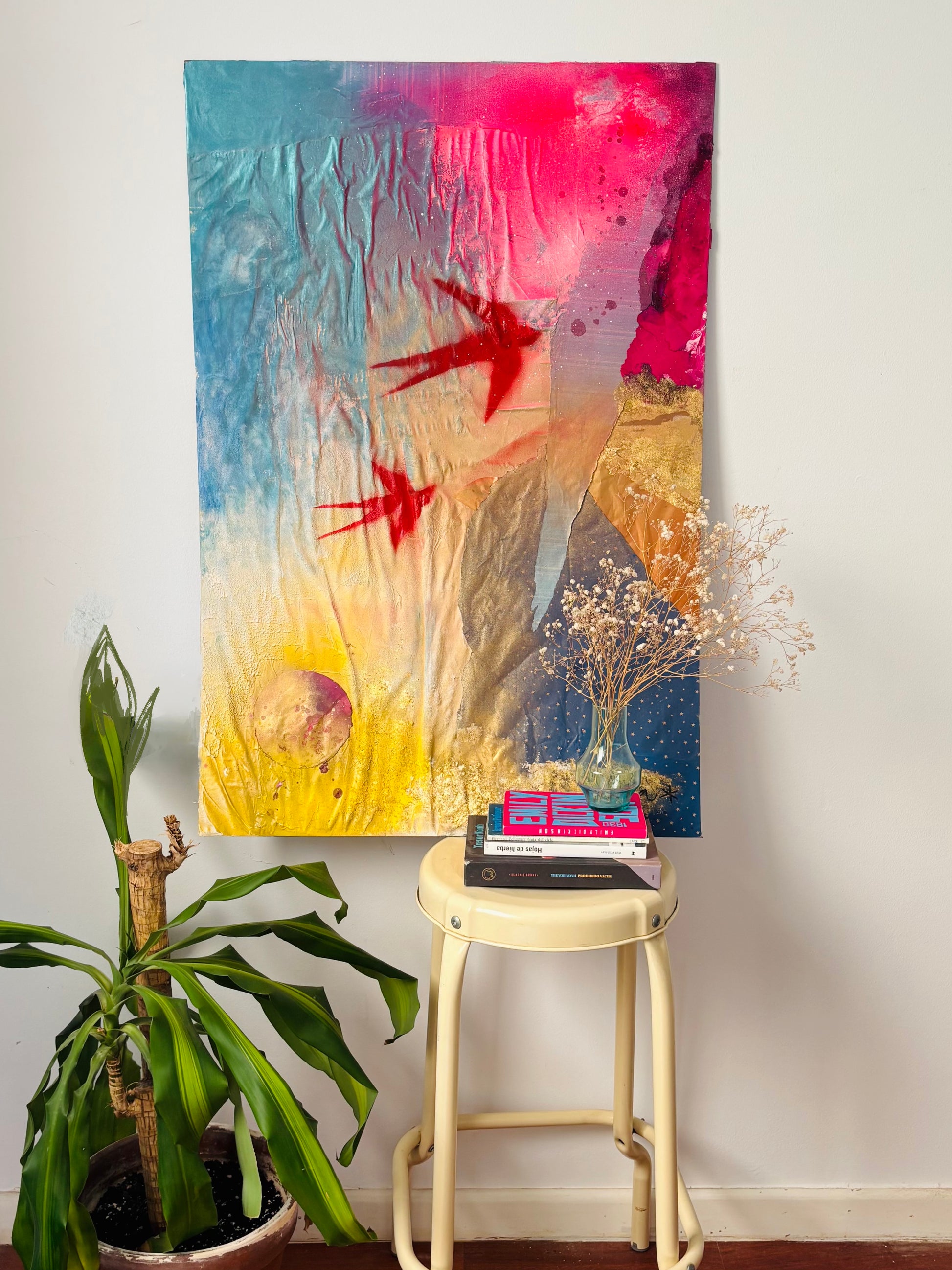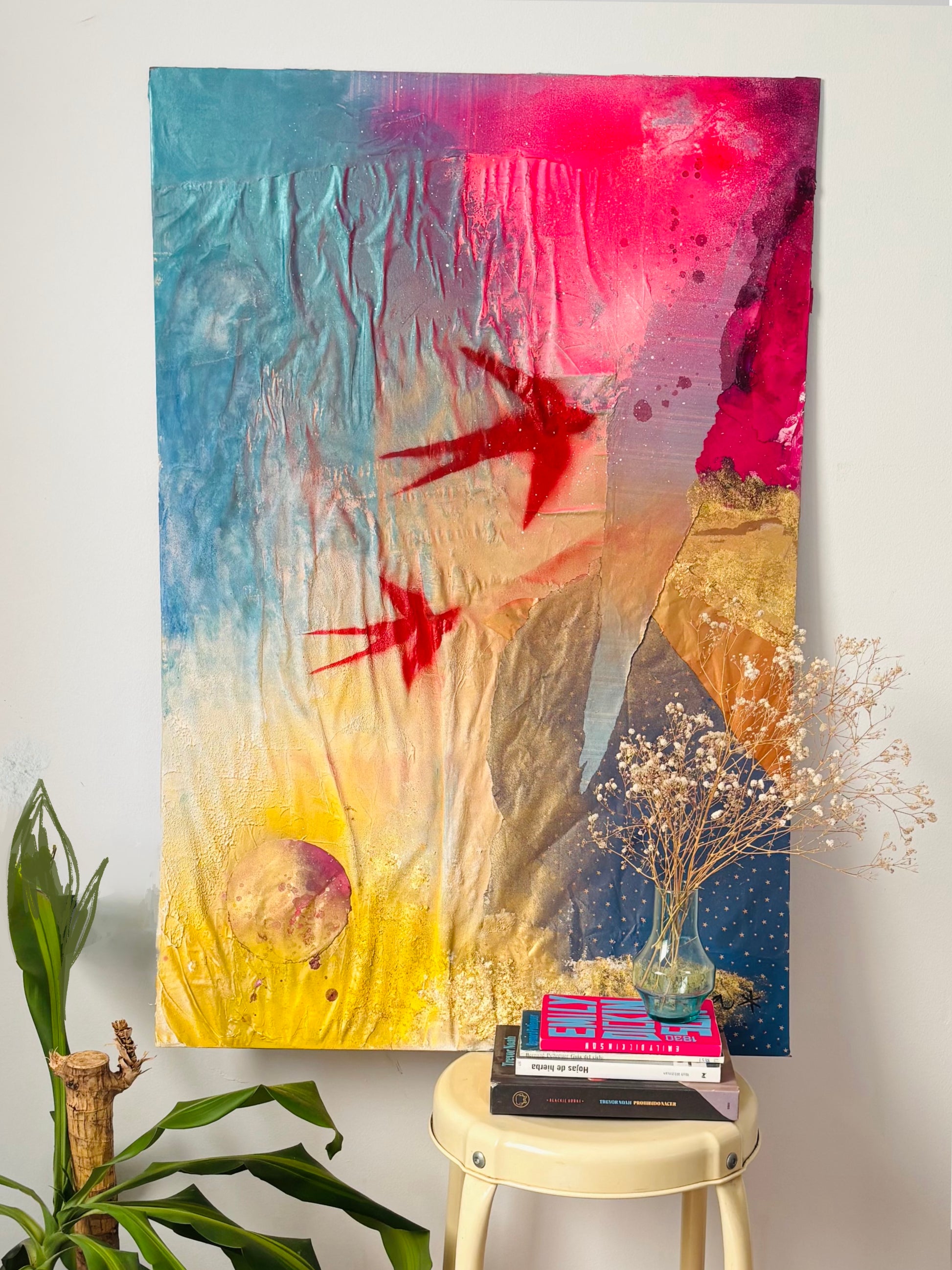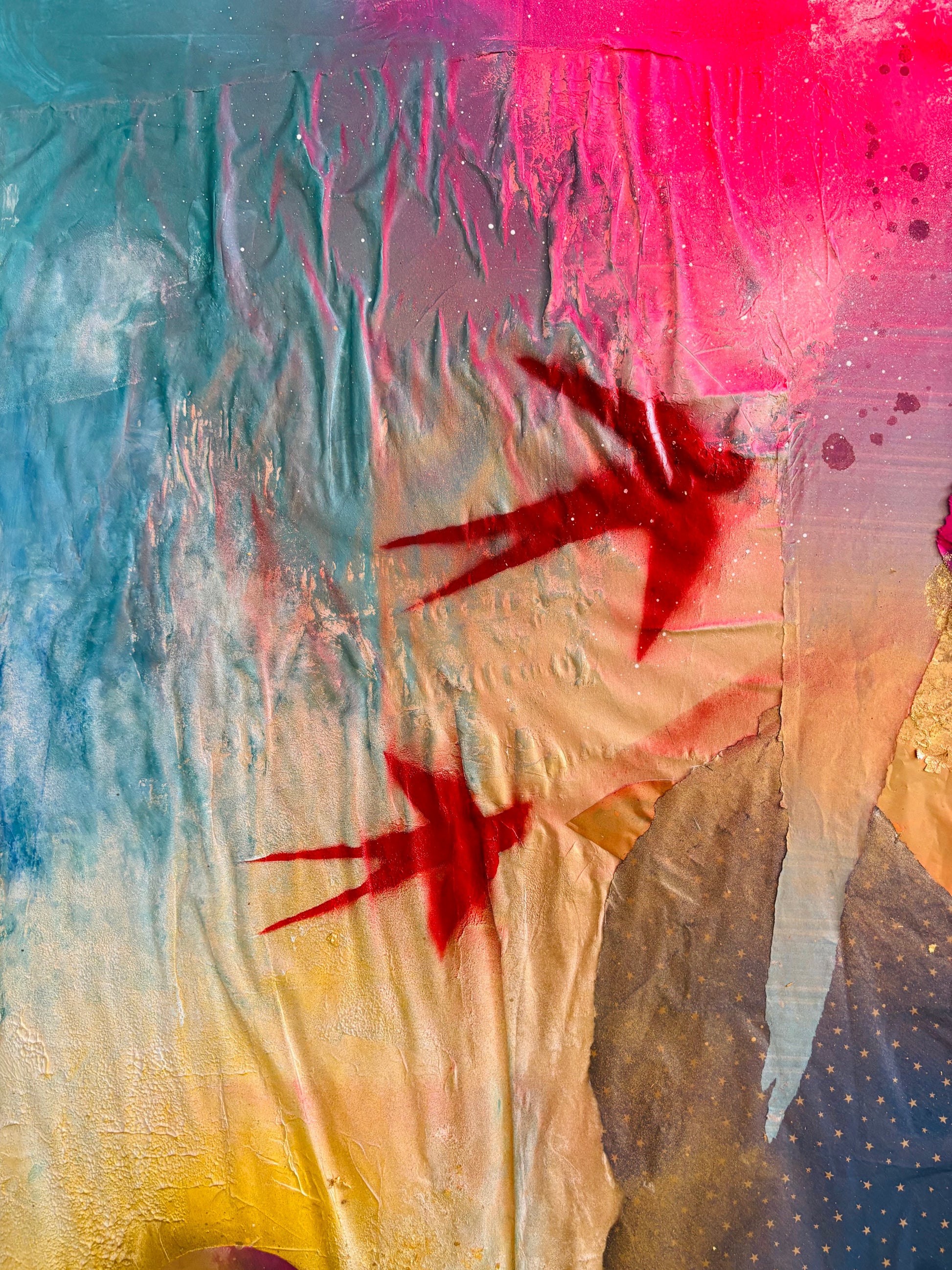 Aurora es origen, memoria y juego. Creada a partir de fragmentos íntimos —papeles de regalo de mis hijos, restos de obras pintadas juntos—, esta pieza late como una pared de street art que ha sido testigo de mil historias.