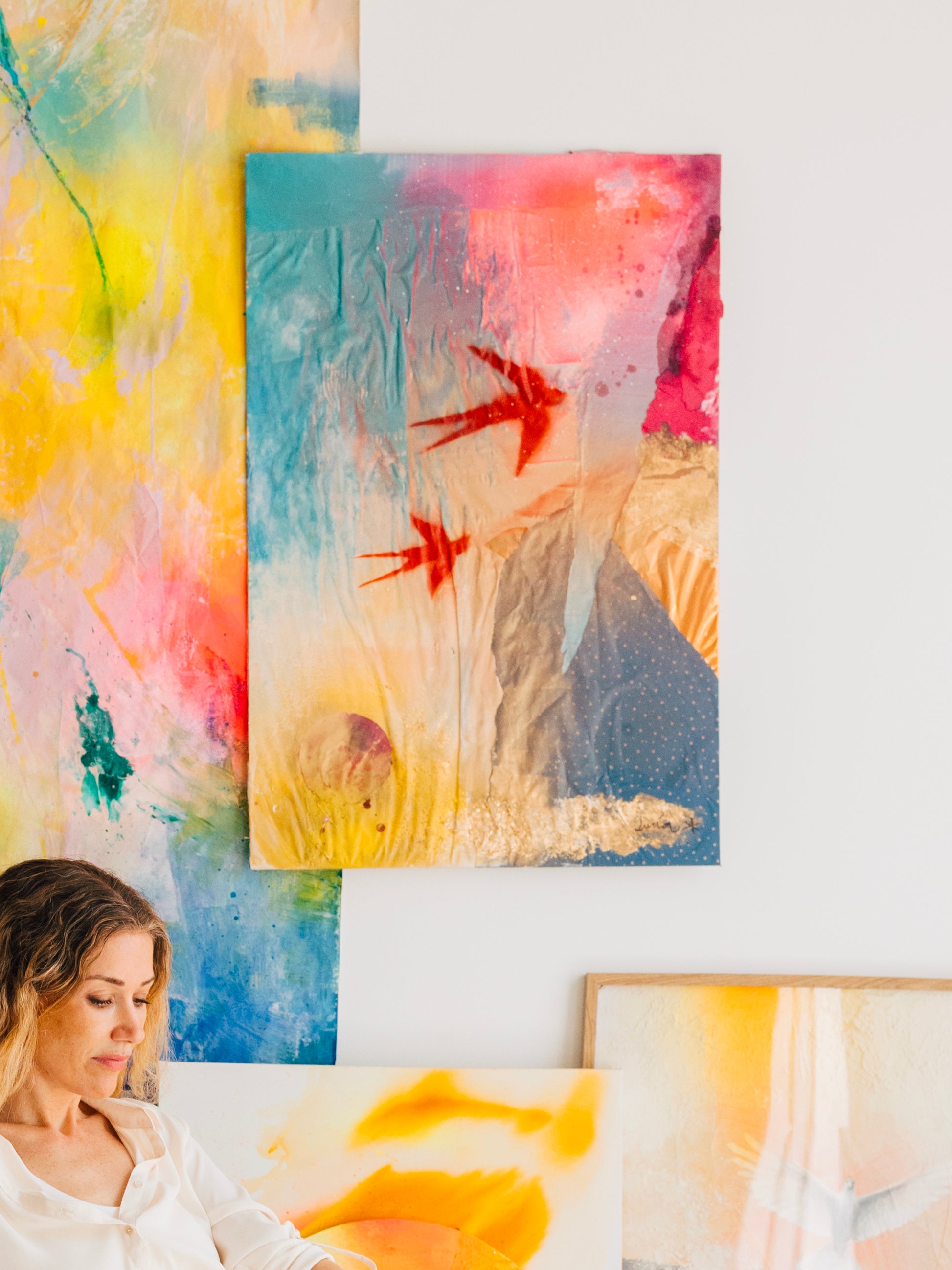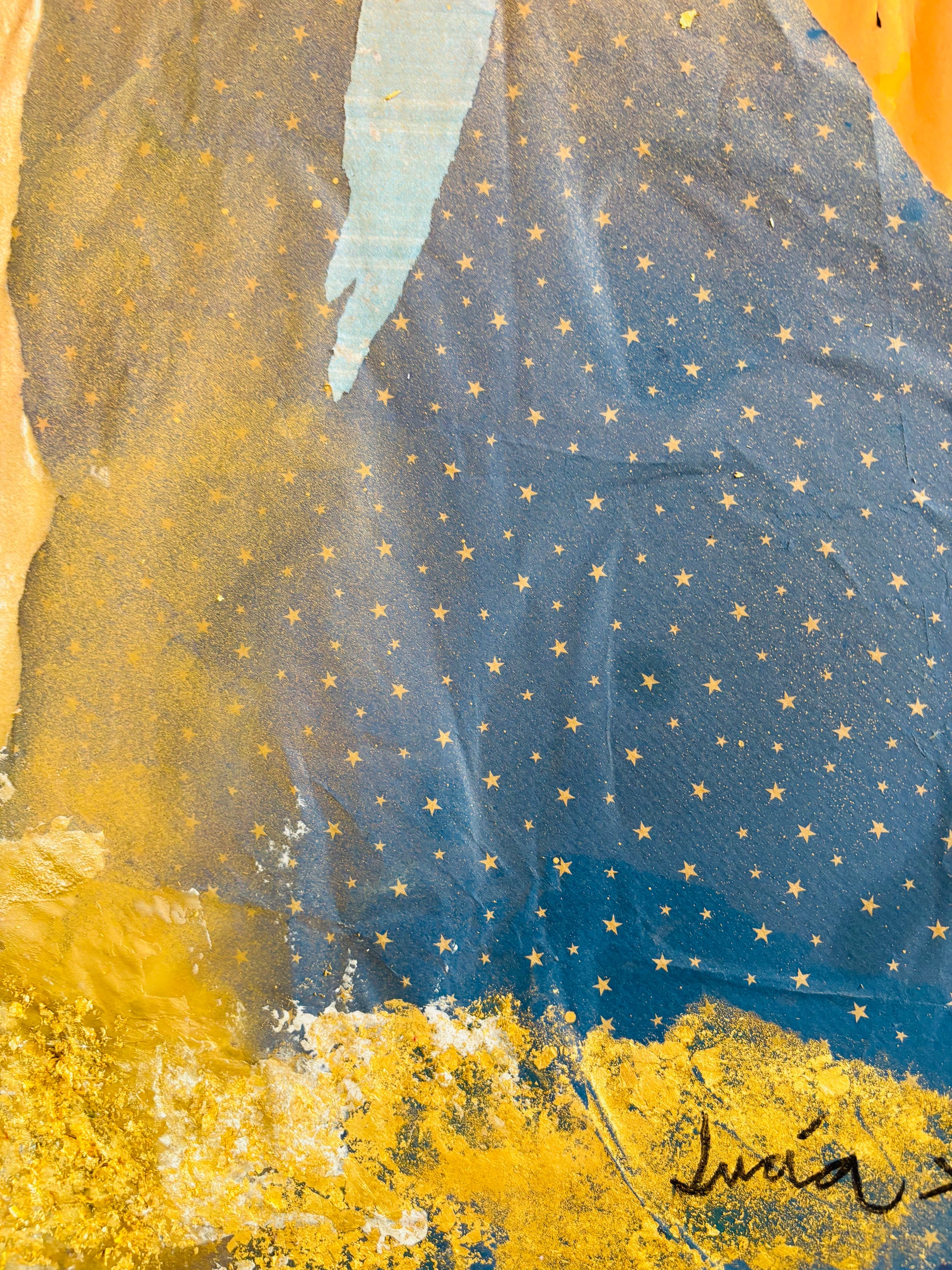 Texturas y dorados que recuerdan amaneceres imposibles, mientras las golondrinas, pintadas con stencil, atraviesan el cielo como símbolos de libertad y regreso. Una obra cargada de personalidad y afecto, de las primeras que hice. Y justo por eso lleva en sí esos primeros tiempos, la fuerza de lo irrepetible.