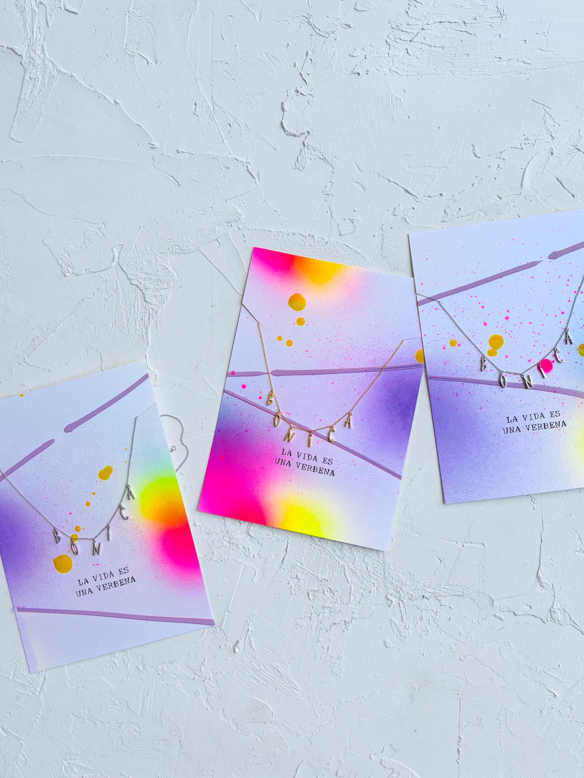 Cada pieza va montada sobre una lámina con la frase “La vida es una verbena”, pintada a mano por mí.