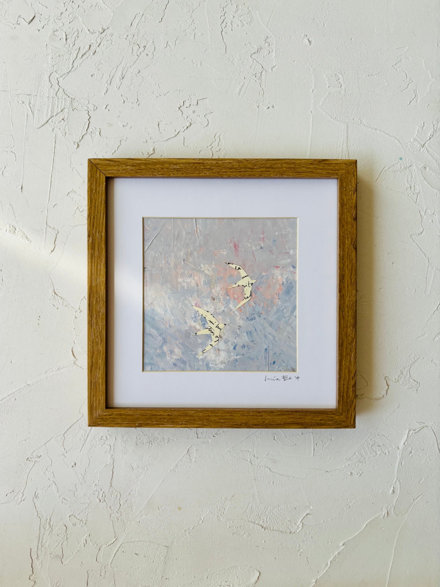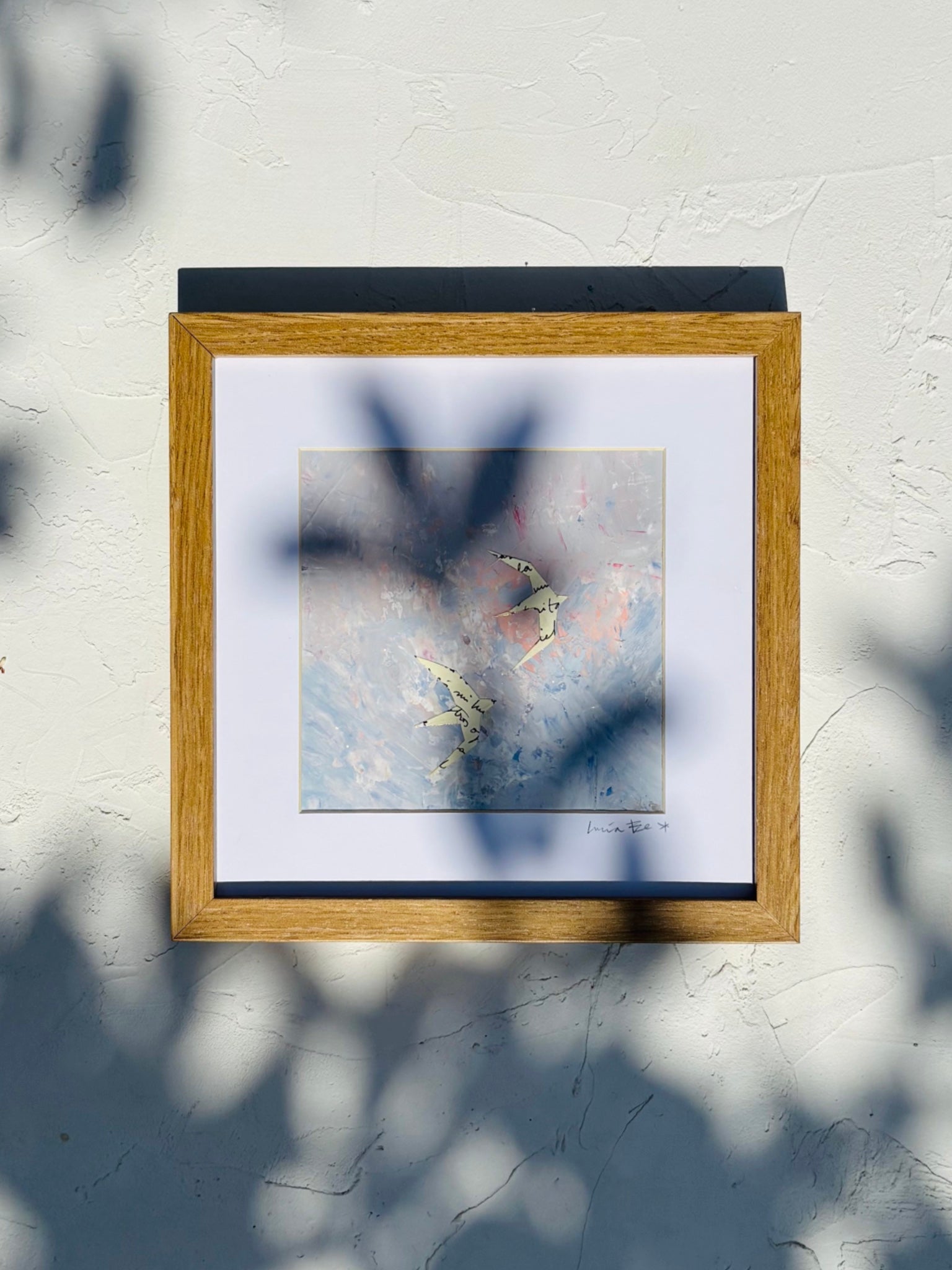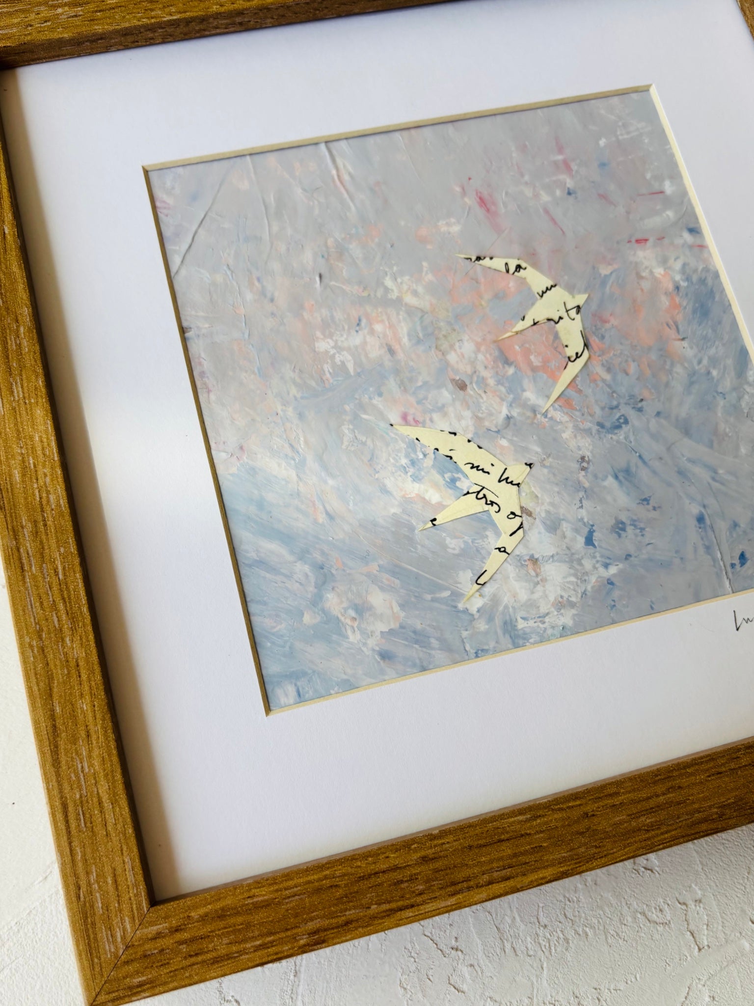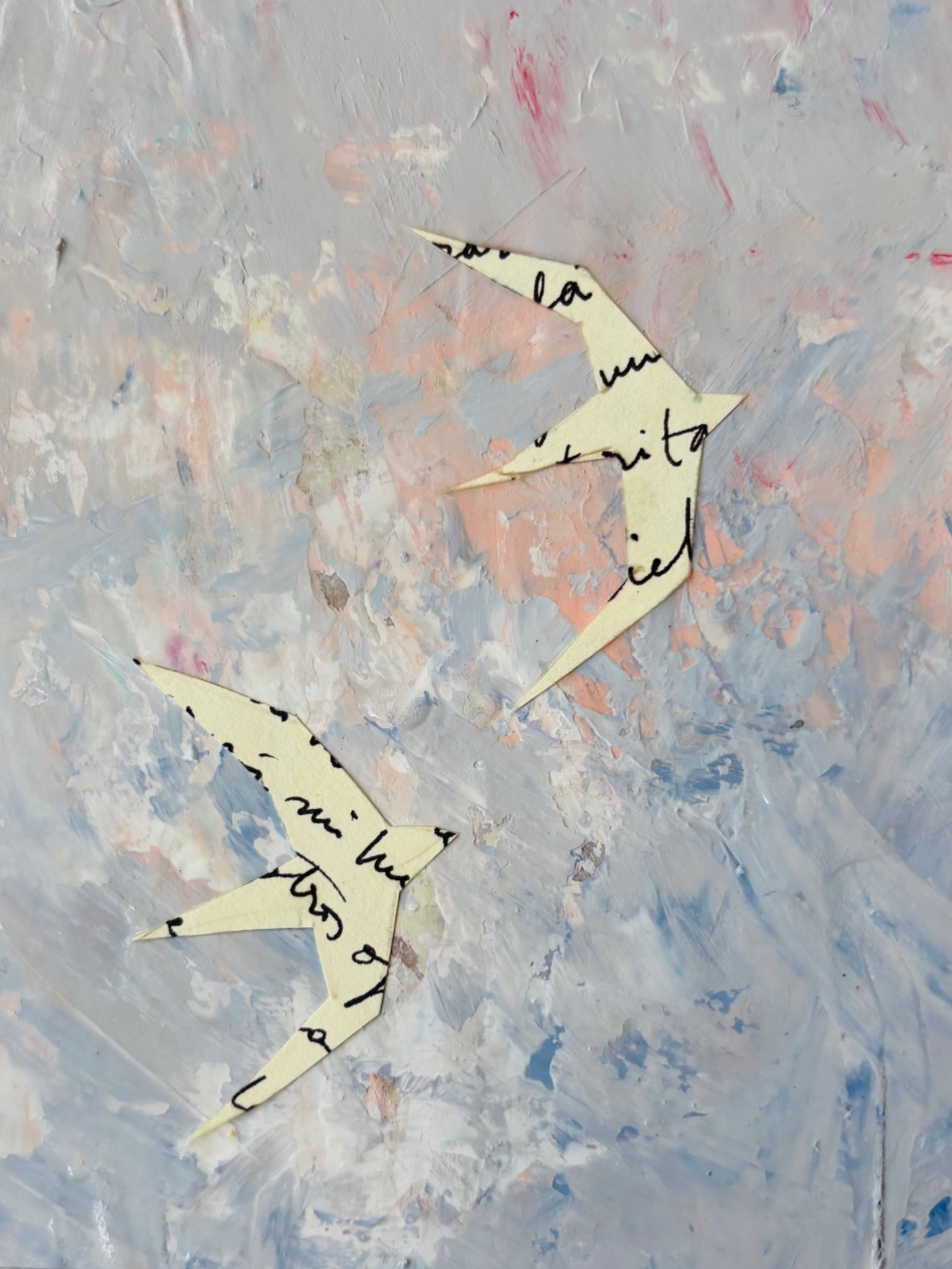 En el gris rosado de una aurora naciente, dos golondrinas recortadas en papel manuscrito cruzan el cielo, memoria de un viaje compartido.