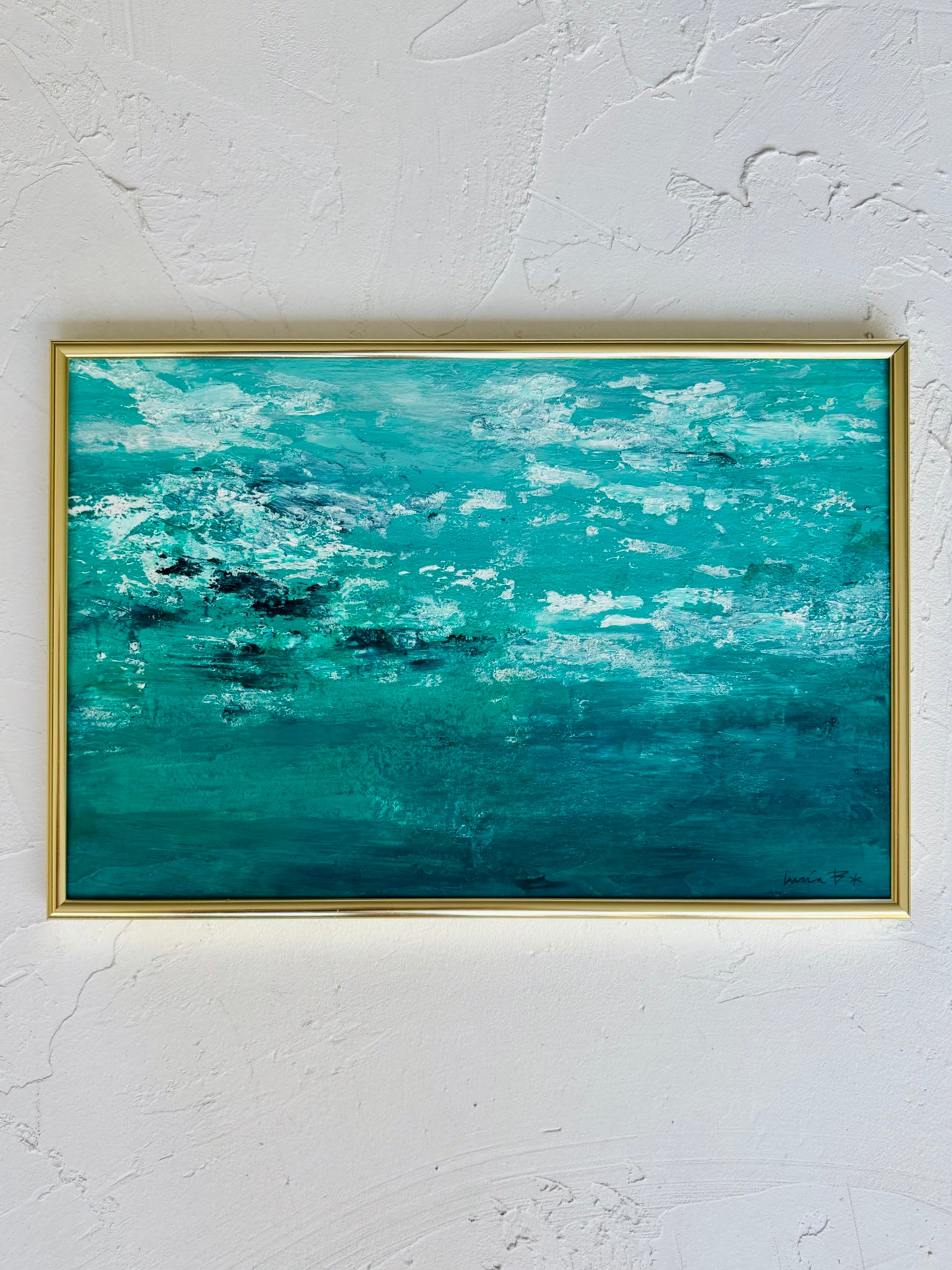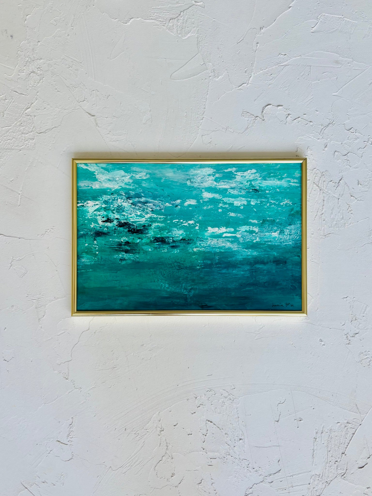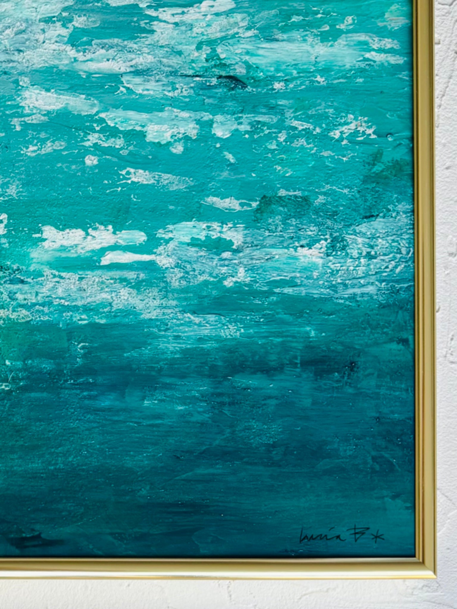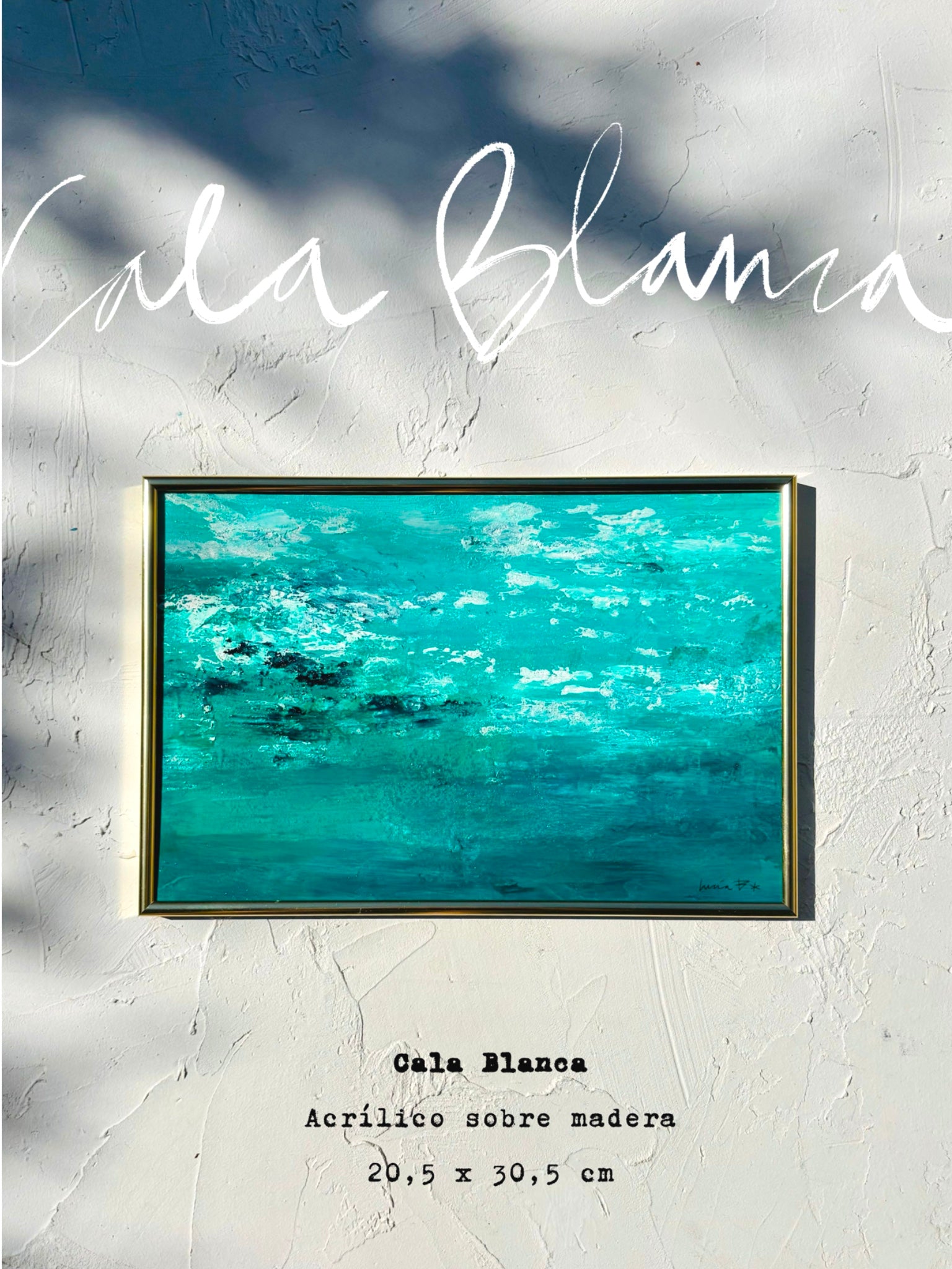 En Cala Blanca, el color del mar cambia según la hora: por la mañana, un azul frío y cristalino; al mediodía, turquesa intenso; y al caer la tarde, un verde profundo que recuerda a la piedra pulida. Ese juego cromático es parte de su magia y lo que inspiró este cuadro: no pintar solo un paisaje, sino una atmósfera.