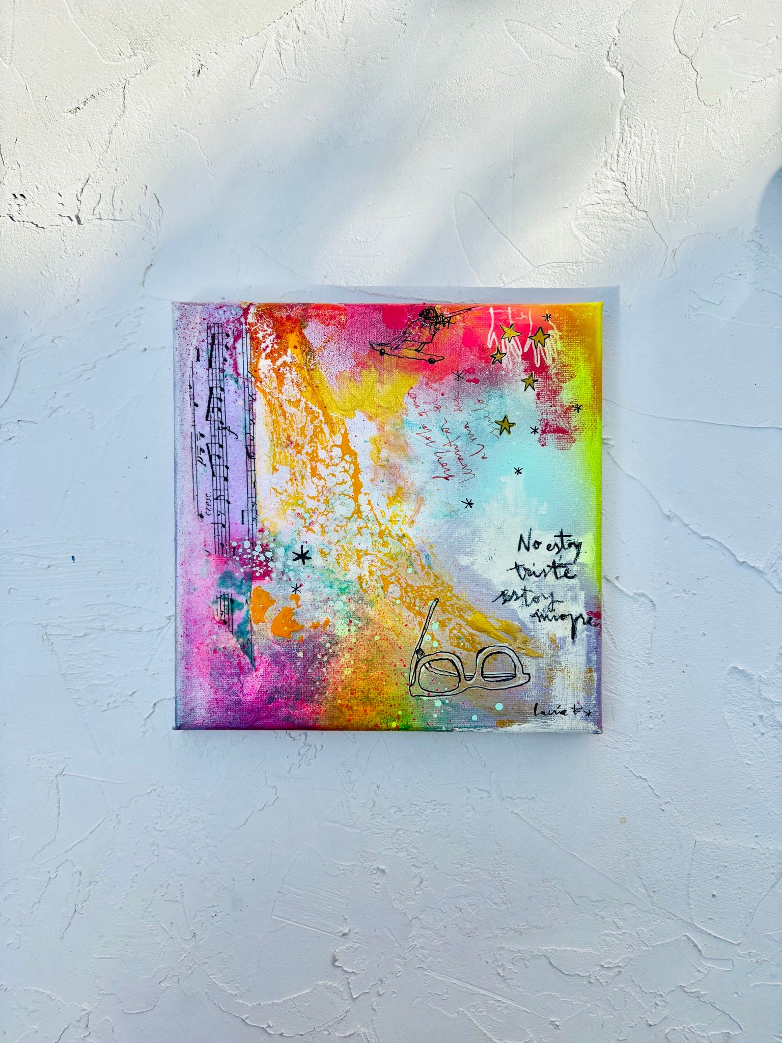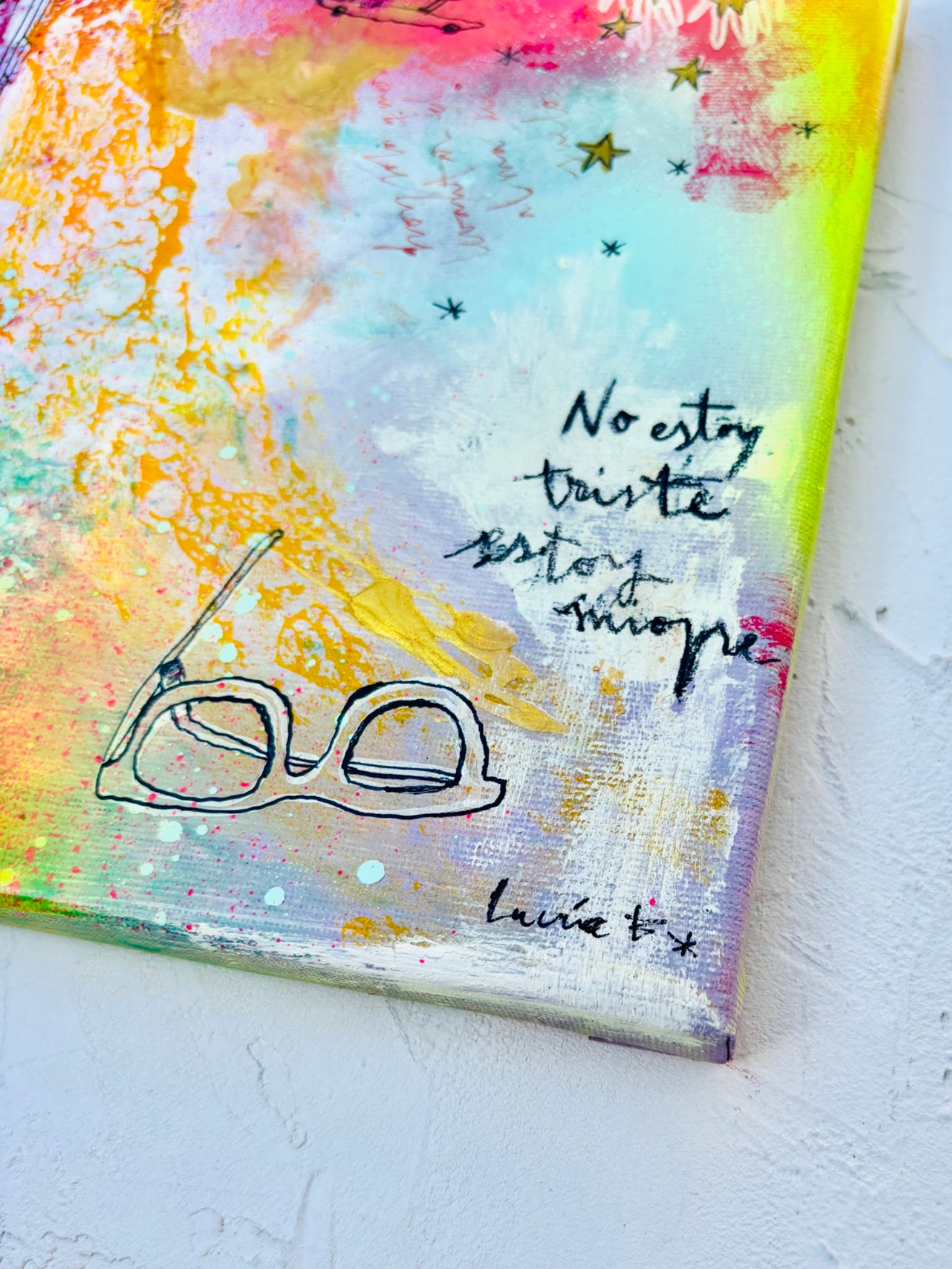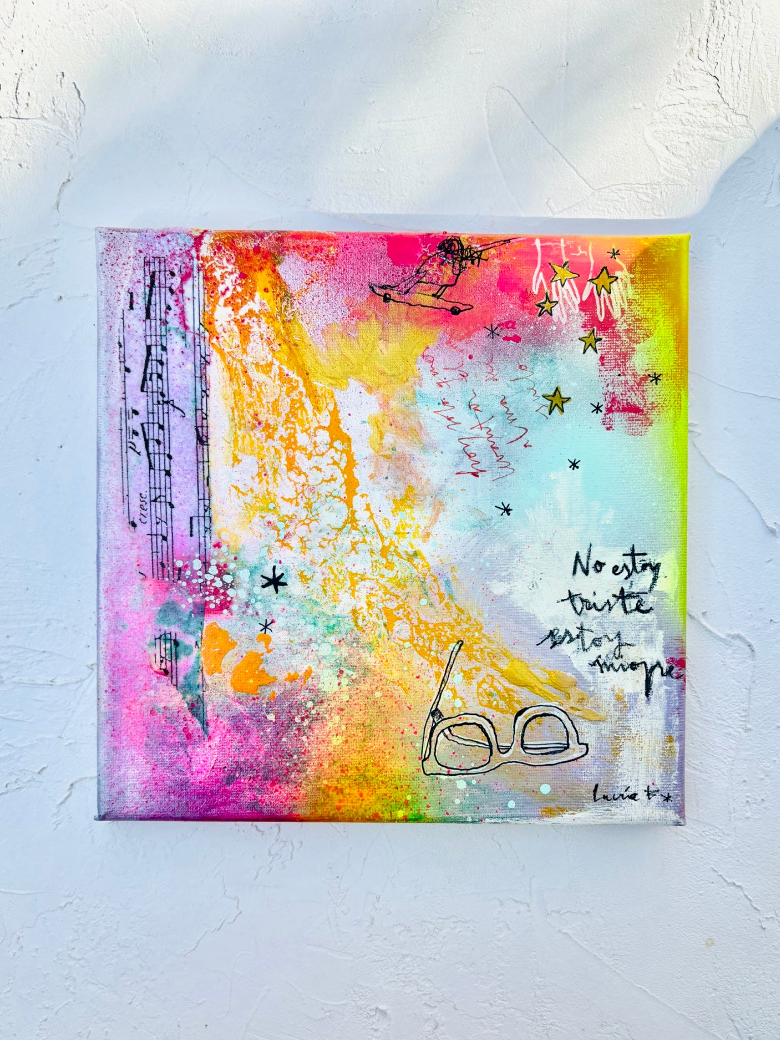 TÉCNICA: Partituras antiguas, spray, ilustración, trabajo de texturas y escritura a mano.