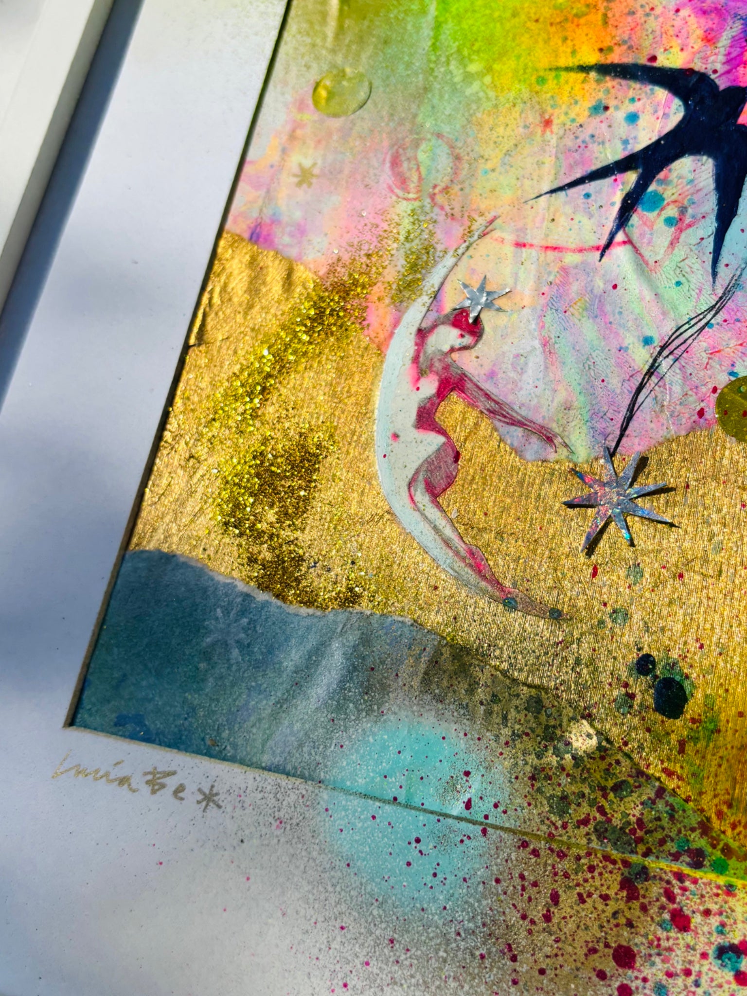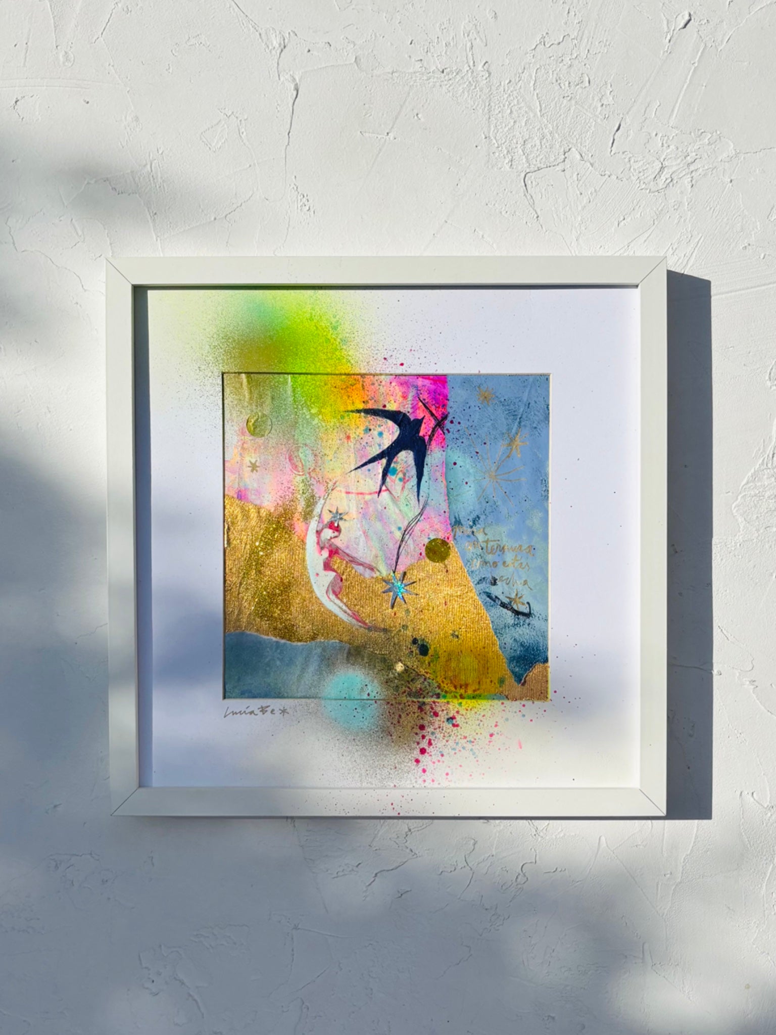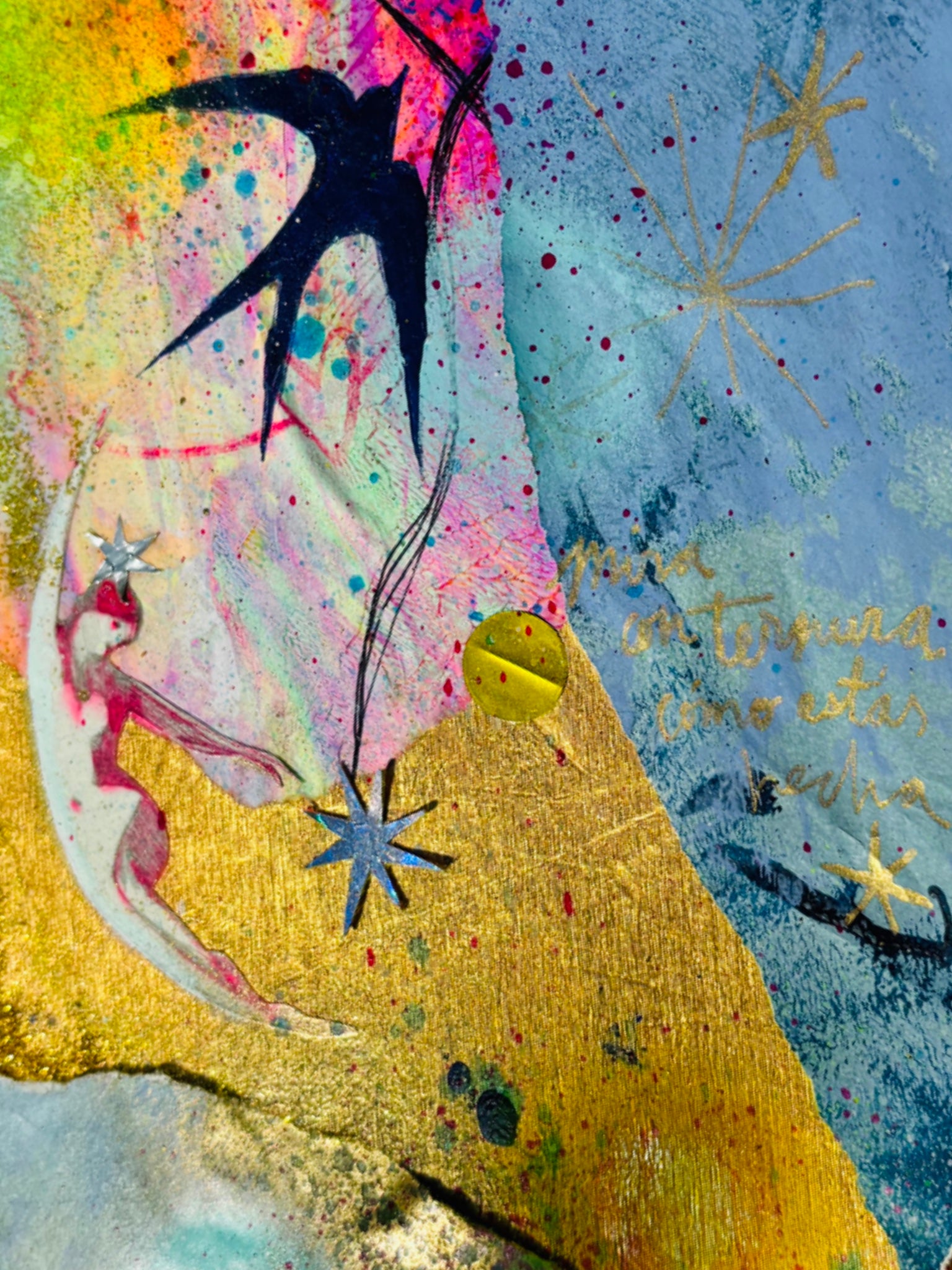 Una escena suspendida entre sueño y vigilia. Un collage de gestos y colores que se encuentran en un mismo lugar: el vuelo, la figura, la frase escrita a mano…