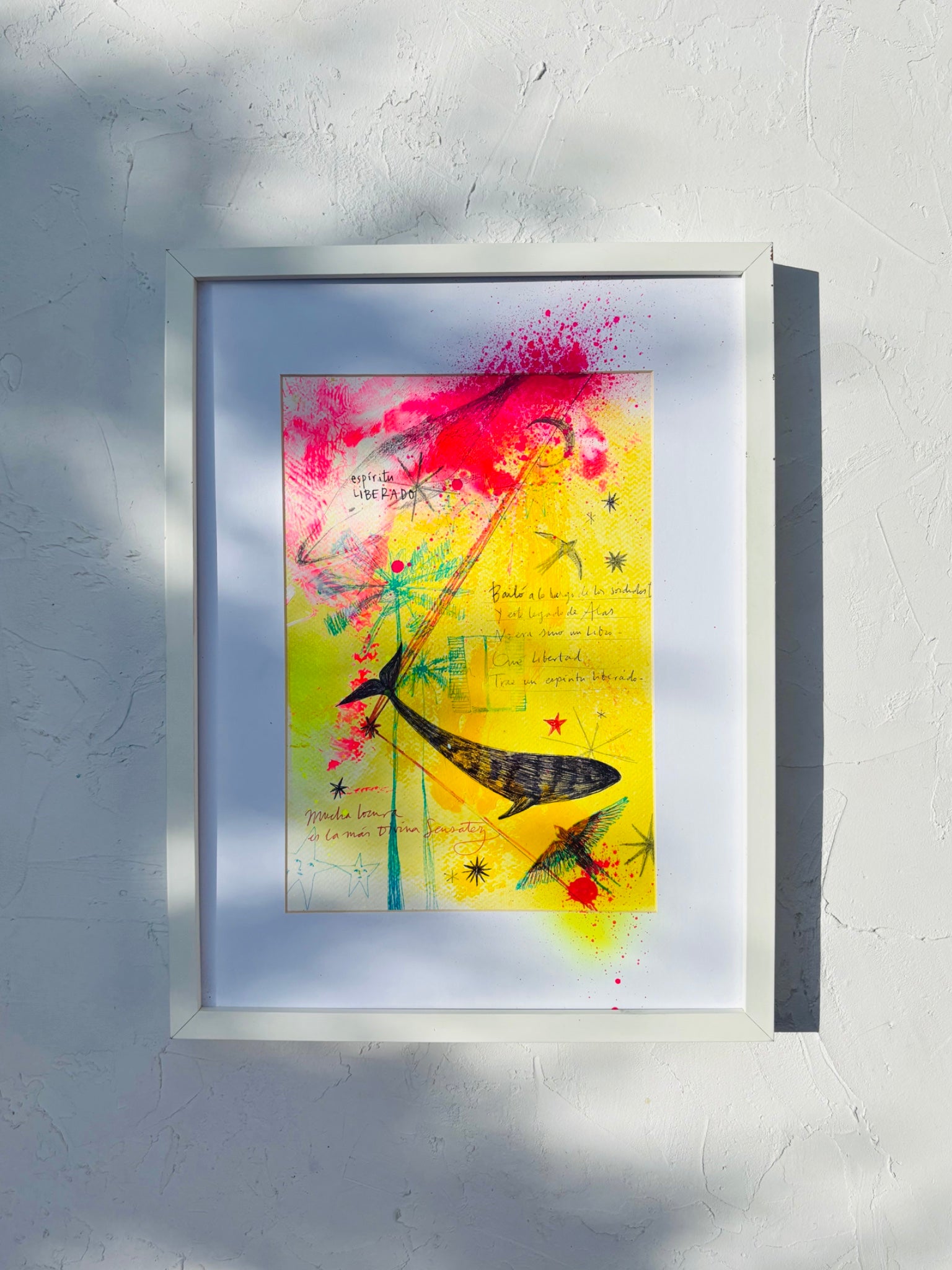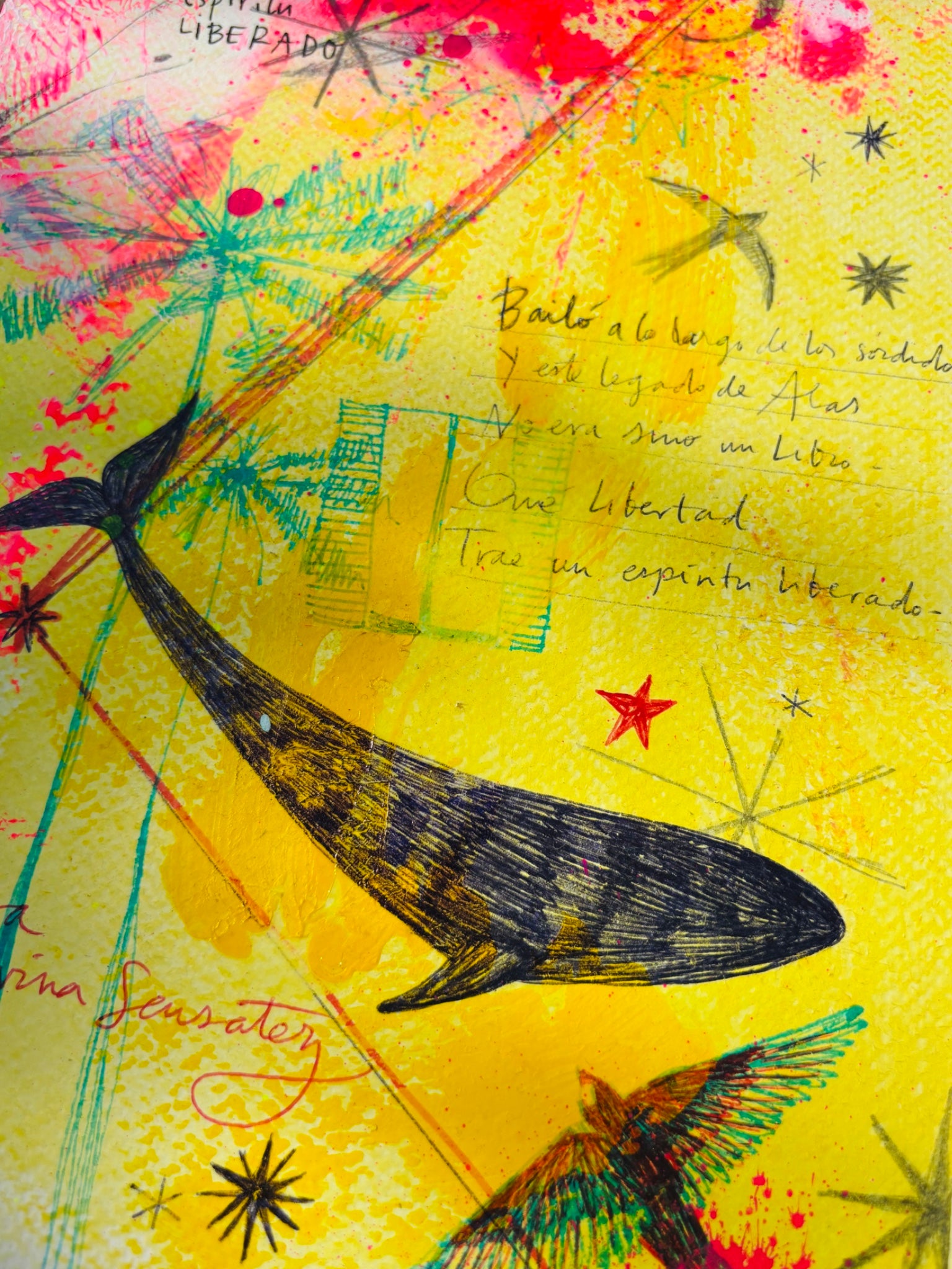 Bajo un estallido de color, una ballena surca un océano imaginario de estrellas y aves. Los versos de Dickinson se convierten en una brújula de lo que es la libertad.