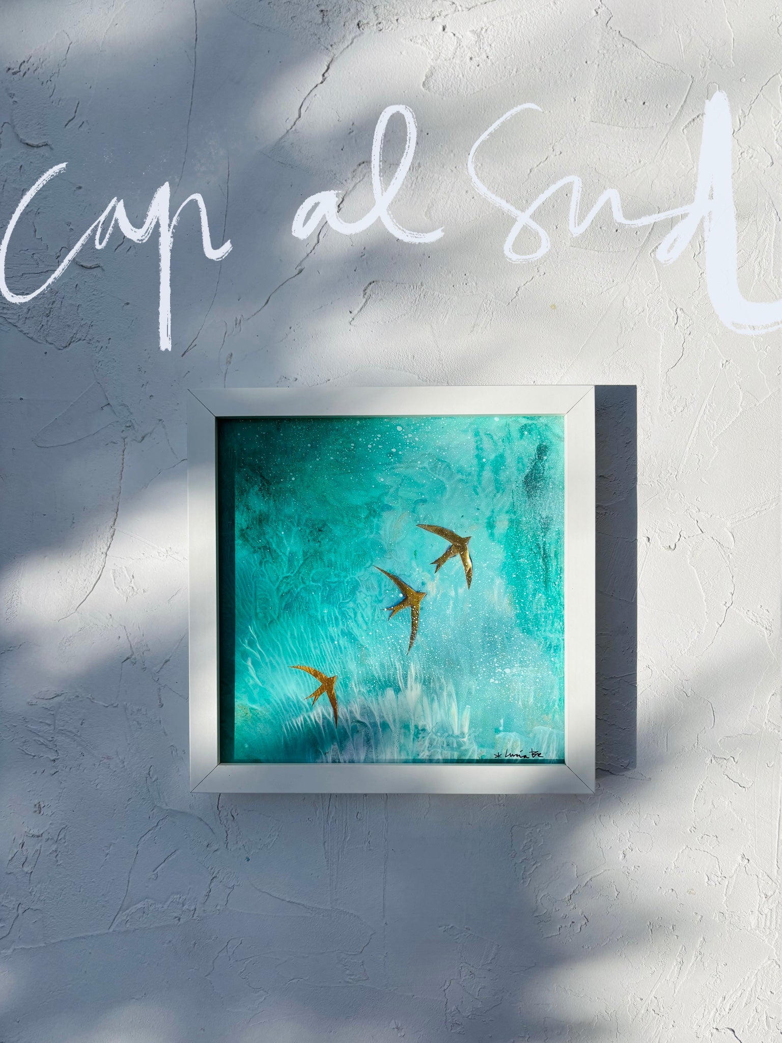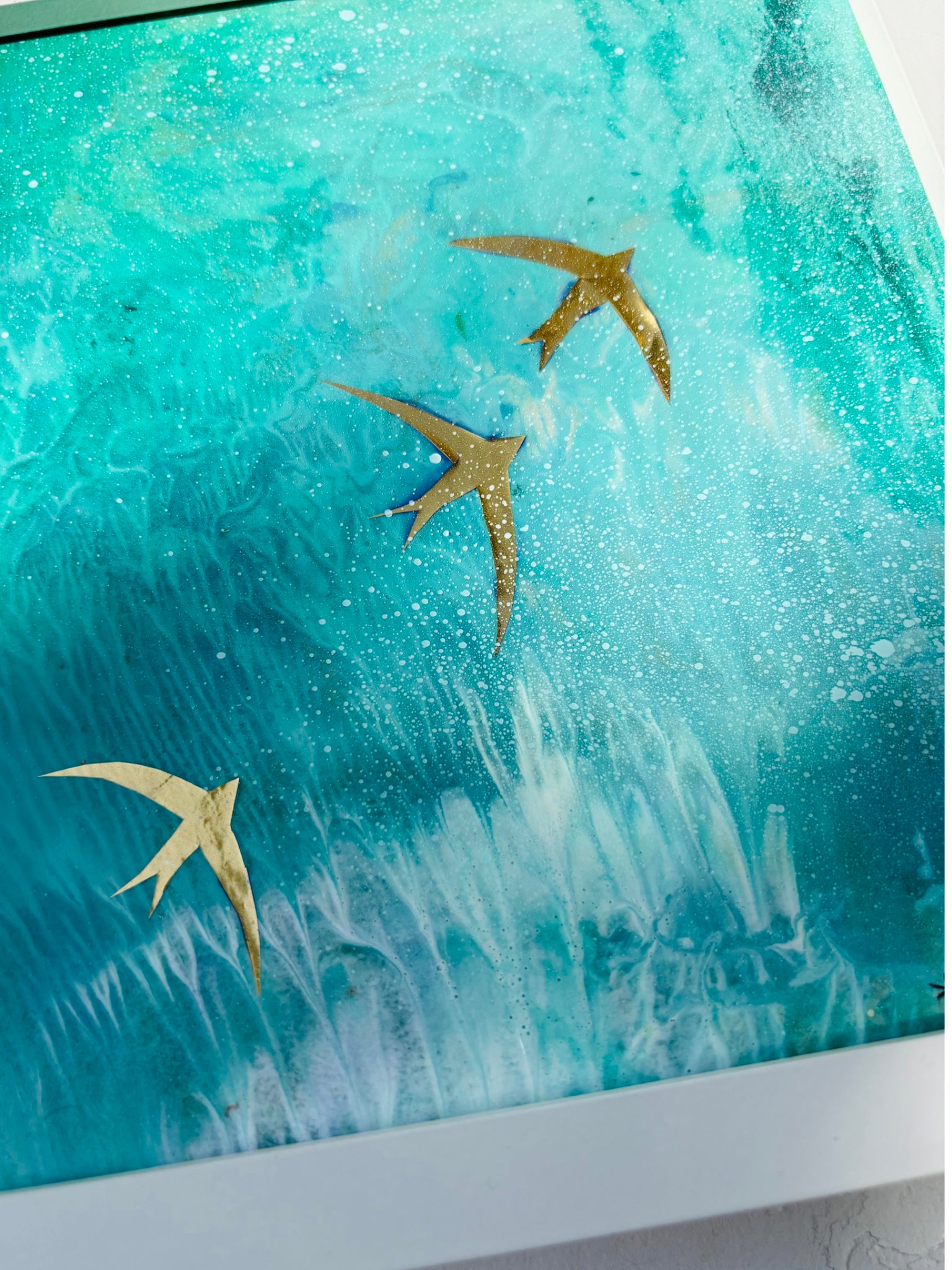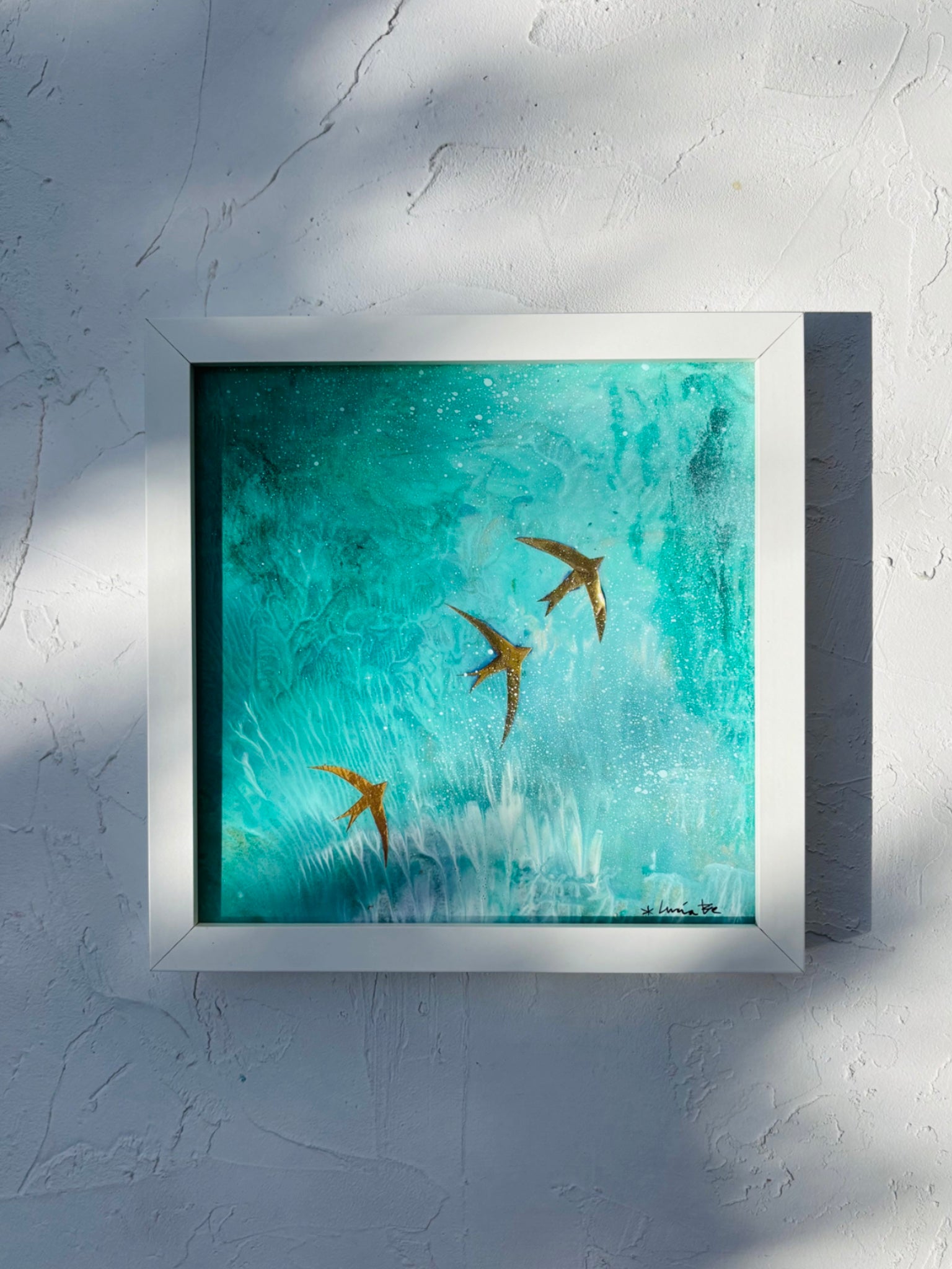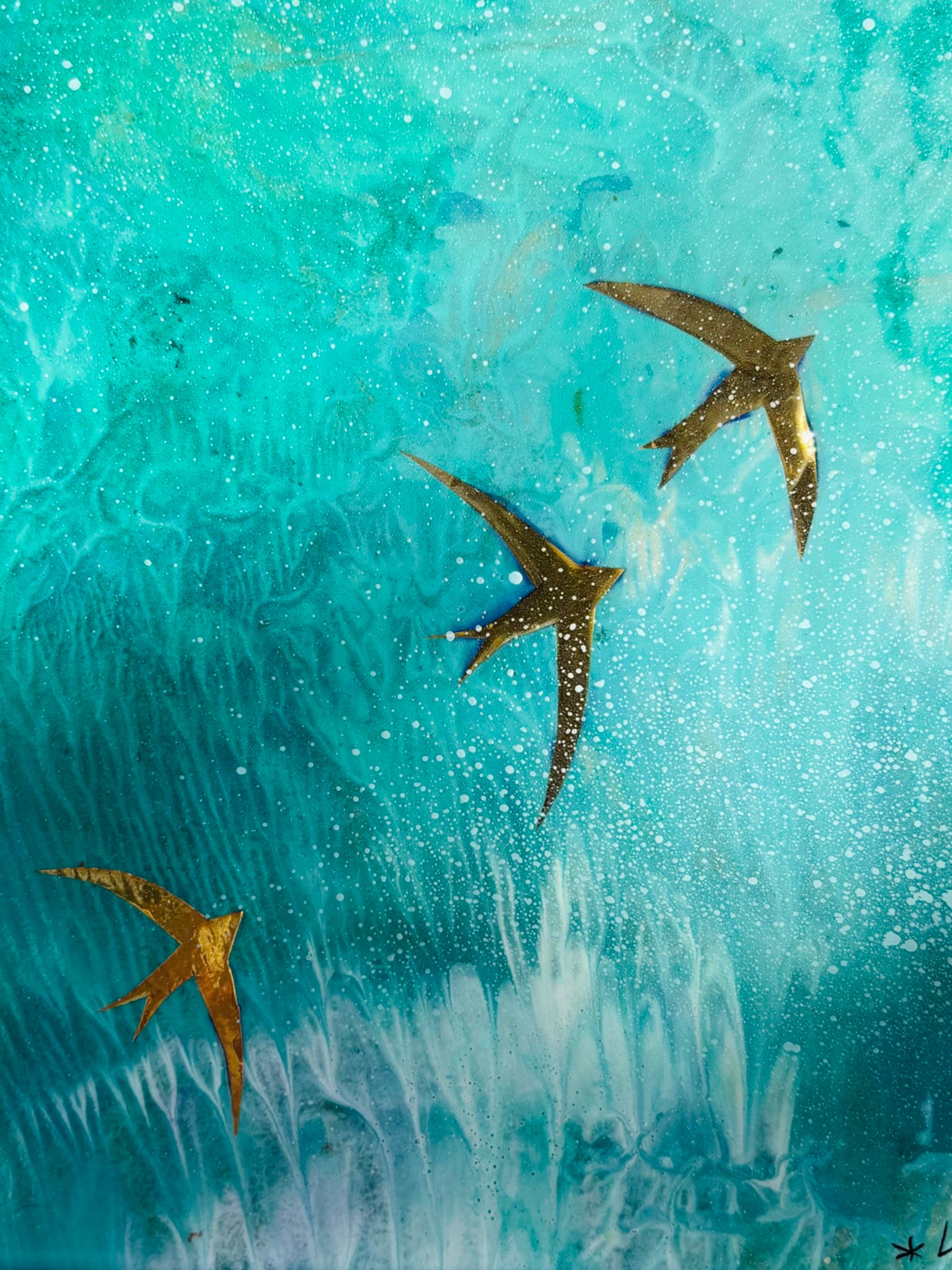 Un cielo líquido que abraza el vuelo. Tres golondrinas de oro atraviesan un mar suspendido entre luz y sombra, recordándonos que el sur también es un lugar dentro de nosotros.