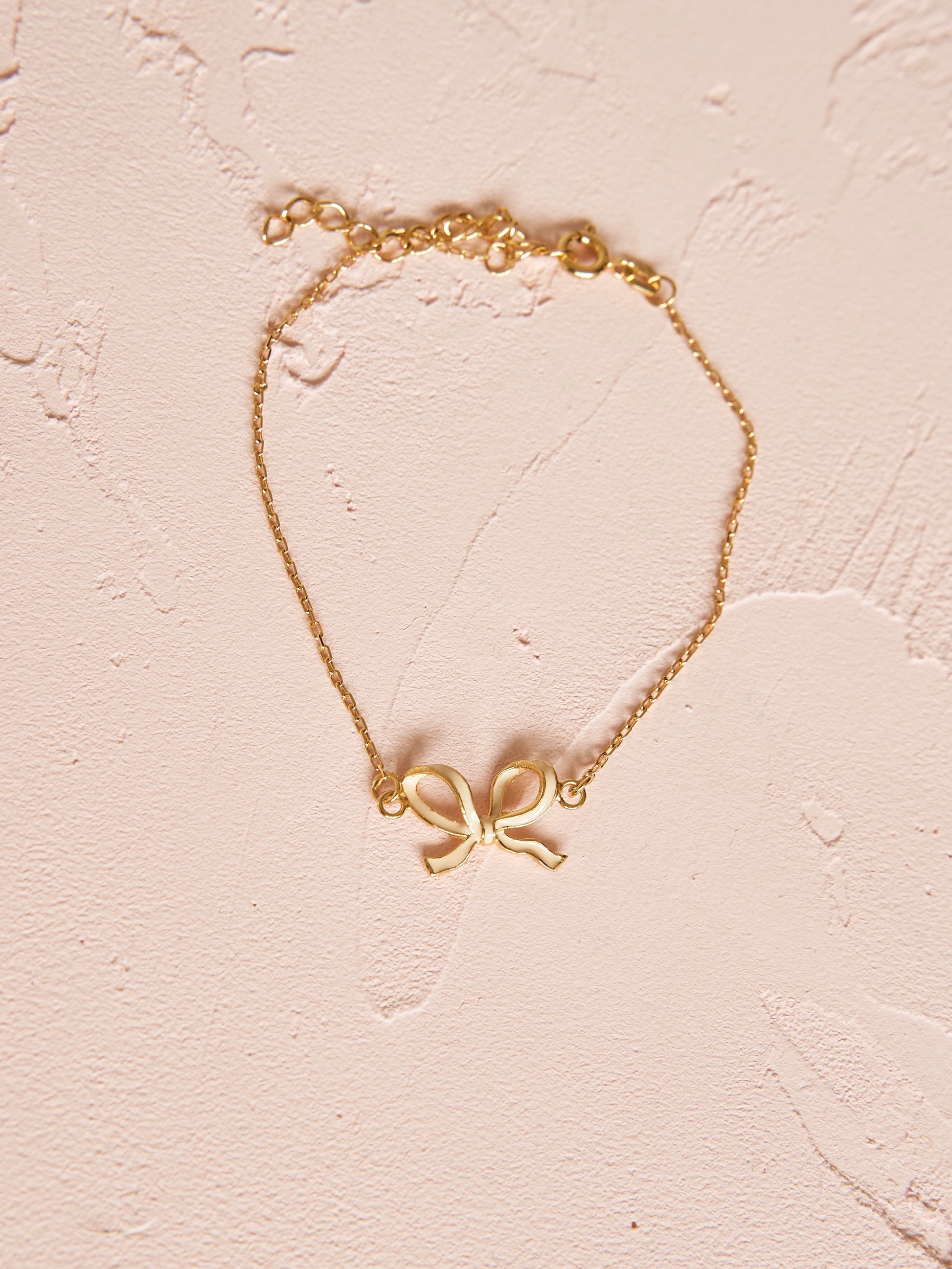 Pulsera de plata bañada en oro con lazo esmaltado en rosa y dorado.