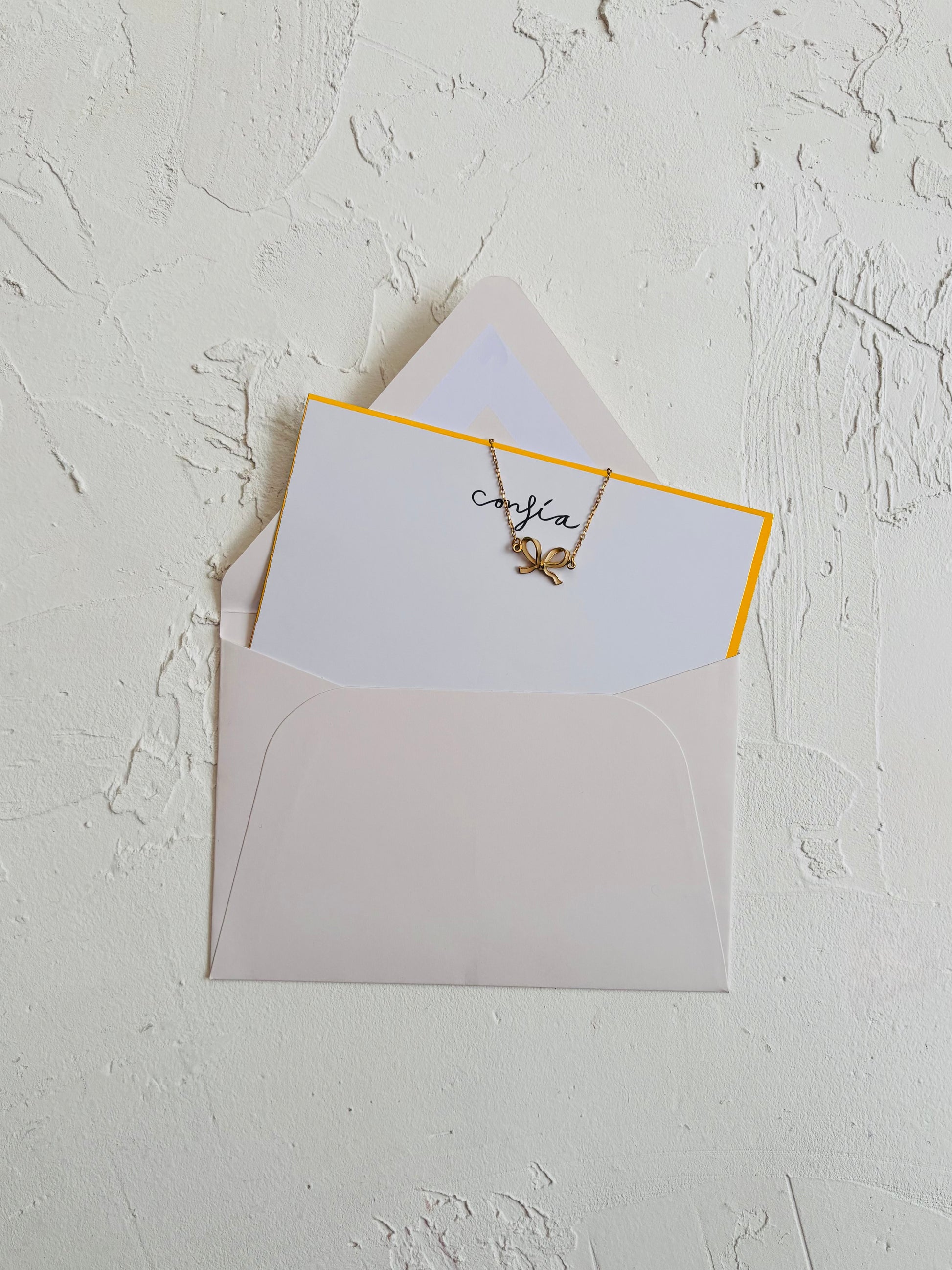 - Presentada en sobre CONFÍA con corazón dorado y bordes en oro.
